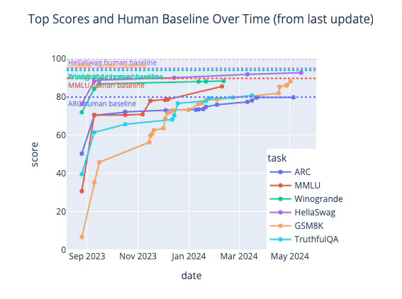 Hugging Face explained their changes in a blog, starting with a plot of average benchmark scores over the last year showing converging and plateauing performance. This led to little differentiation between the significant models they tested. They also discovered that some of the benchmarks they used had errors, so the old system needed updating.