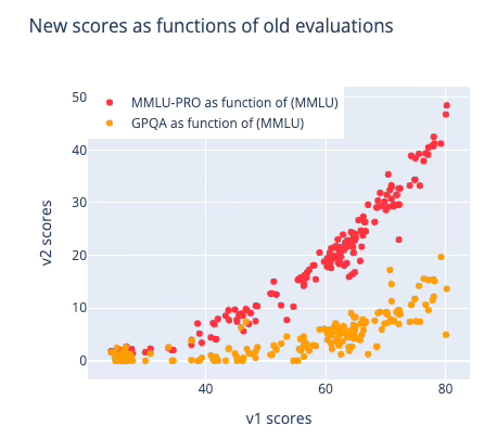 To respond to these problems, Hugging Face released a new version of the leaderboard with more challenging benchmarks. Their blog shared a plot showing how scores shifted downward for the same models between updated benchmarks.