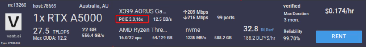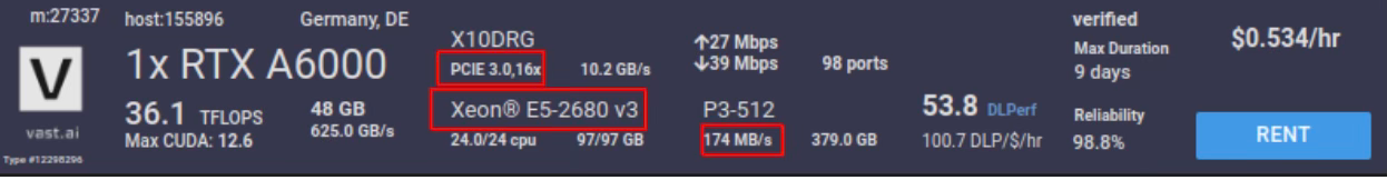 Disk speed: Although disk speeds are generally decent across hosts, it’s important to keep in mind the same potential bottleneck mentioned in the CPU section. A bottleneck in disk read speed may lead to GPU idling during computation. Usually, 2000+ MB/s should be enough for most scenarios.