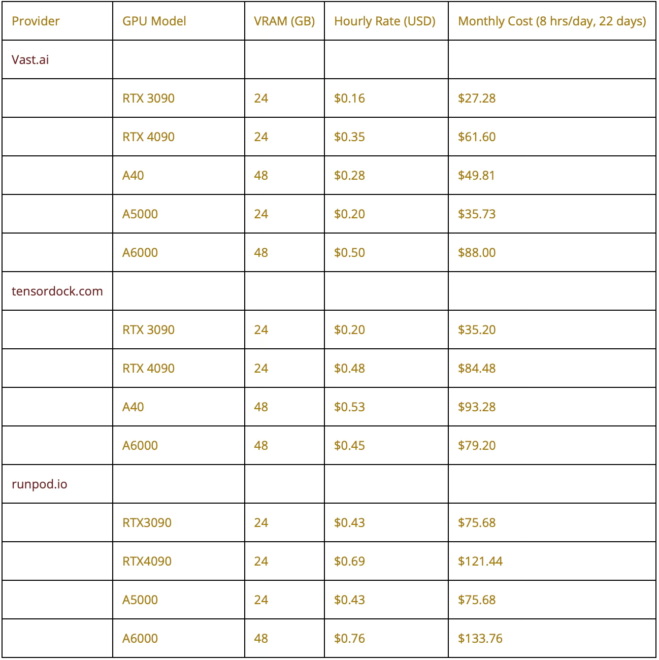 First, let's discuss some numbers. We'll compare Vast.ai with its competitors in the nearest price range, using the most common and popular configurations.